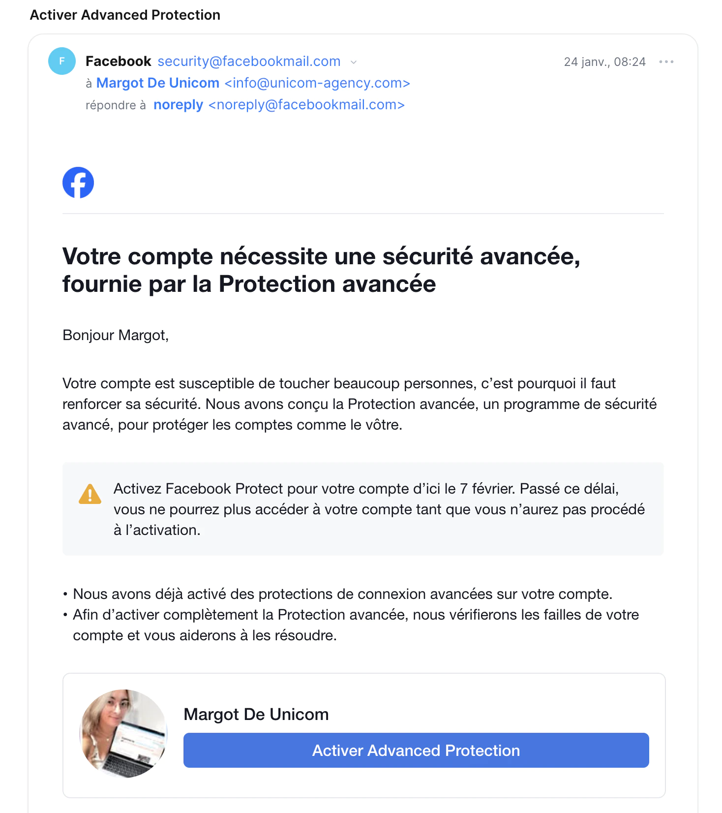En cas de message reçu, vérifiez toujours l’expéditeur : security@facebookmail.com correspond à une adresse officielle de Facebook.